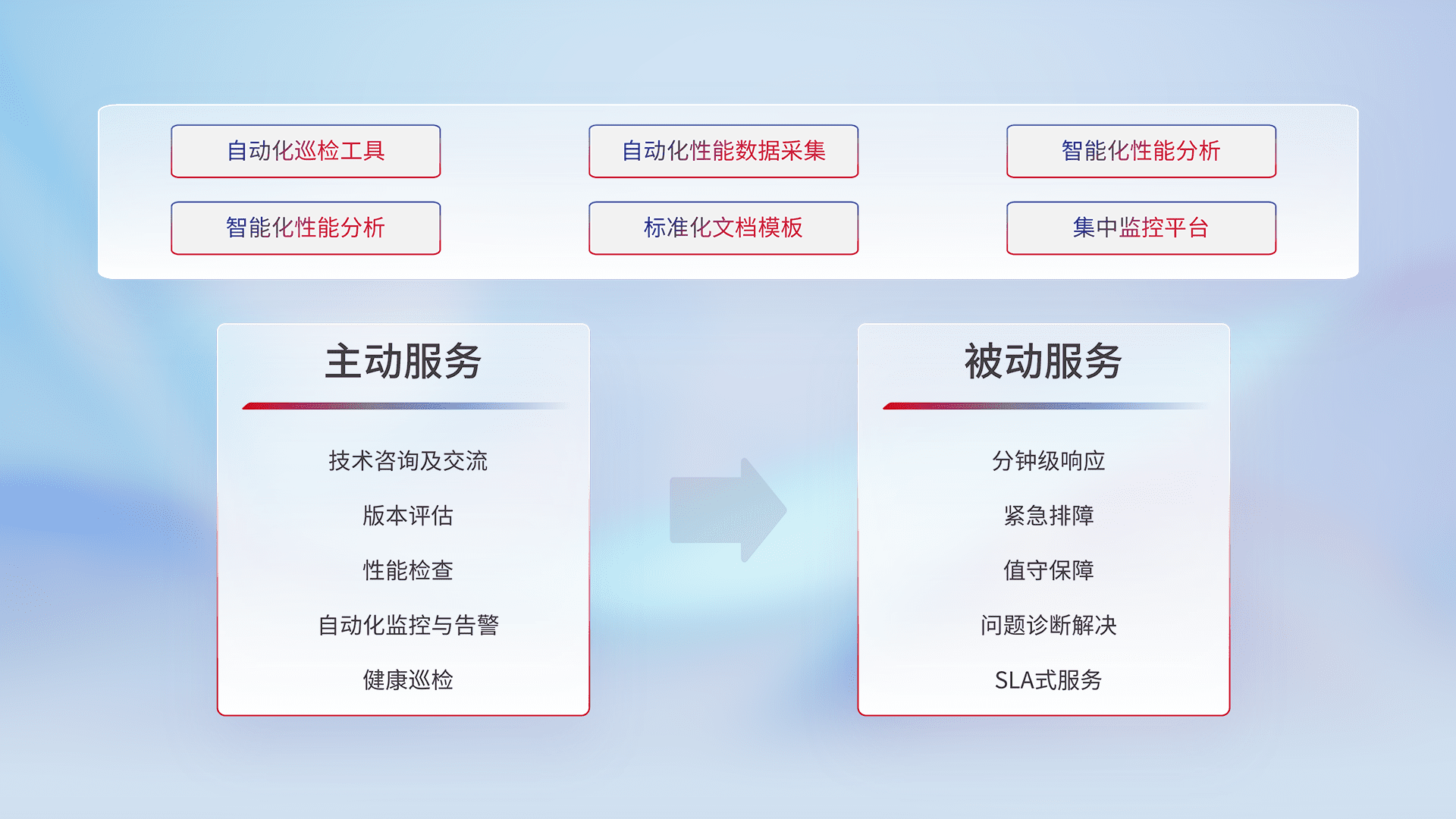 智能化工具和标准化文档,,,保障服务质量,,,,提供主动服务(包含技术咨询、、、、版本评估、、性能检查、、、、自动化监控与告警、、、健康巡检)和被动服务包含(分钟级响应、、、、紧急排障、、、、值守保障、、、、问题诊断解决、、、、SLA服务)。。